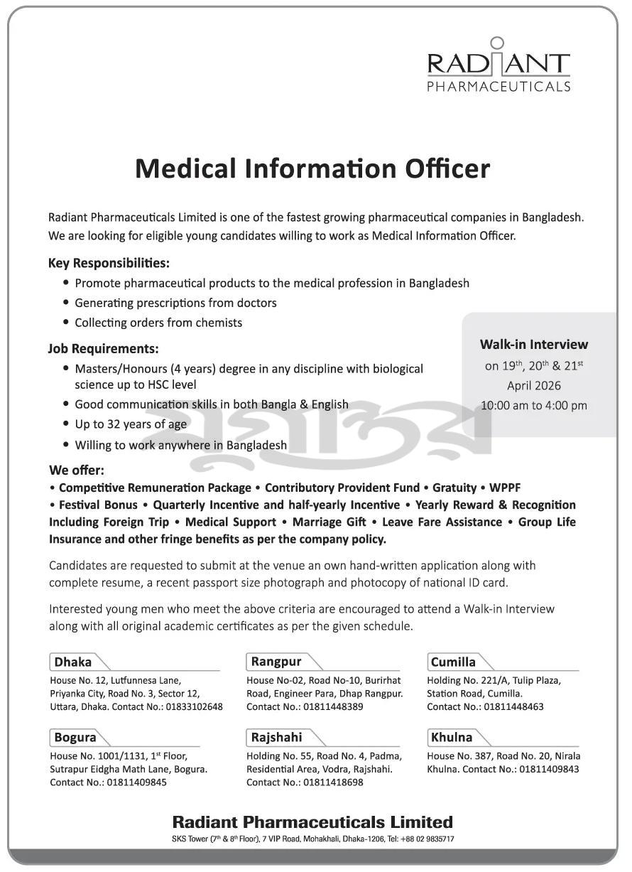 If you want to apply for this job, you should walk into the interview as per the given schedule. Radiant Pharmaceuticals Job Circular 2026 original job circular was converted to an image file so that everyone can read it easily or download this job circular. Radiant Pharmaceuticals Job Circular The Job Circular has been given below.